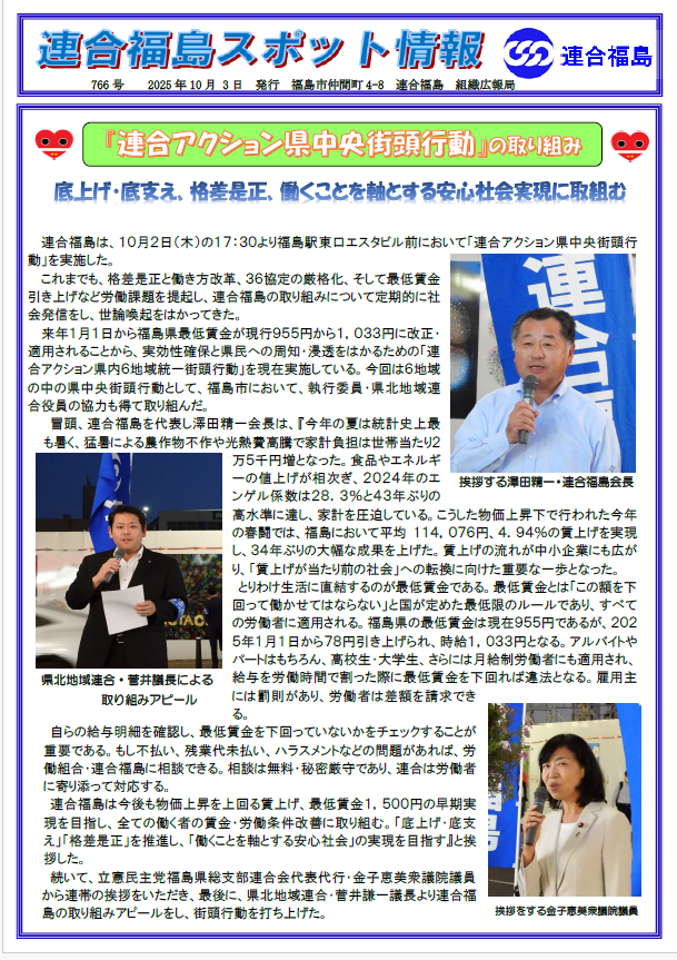 766号スポットニュース底上げ・底支え、格差是正、働くことを軸とする安心社会実現に取り組む