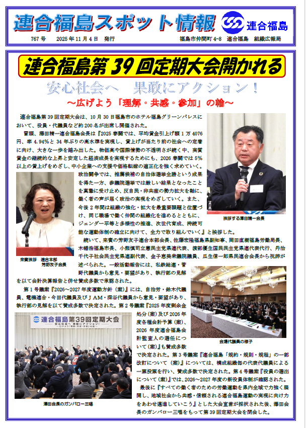 10月30日(木)福島市のホテルグリーンパレスにおいて、第39回定期大会が開催されました。大会には、役員・代議員など総勢200名が参加しました。